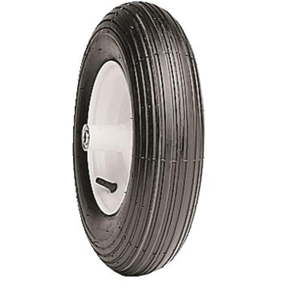 4.00 x 6 rib tread tire and wheel assembly for wheelbarrows or carts. 13.7" O.D.; 2-ply rating; 6" hub length; 5/8" axle shaft; 260-lb. capacity.