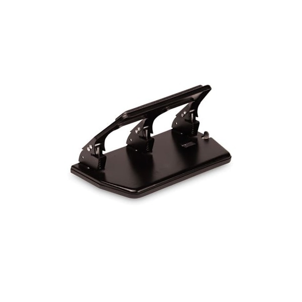 Add comfort to punching tasks with soft-touch gel padded handle. Adjustable paper centering guide ensures accurate punching. Pre-set to punch holes to fit a standard three-ring binder. Lock-down handle; large capacity chip pan. Non-skid feet to keep punch in place while punching. Durable steel construction. Sheet Capacity: 30; Operating Method: Manual; Number of Holes: 3; Hole Diameter: 9/32in.