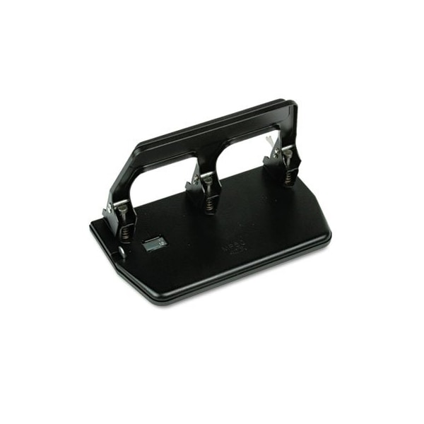 Add comfort to punching tasks with soft-touch gel padded handle. Adjustable paper centering guide ensures accurate punching. Pre-set to punch holes to fit a standard three-ring binder. Lock-down handle; large capacity chip pan. Non-skid feet to keep punch in place while punching. Durable steel construction. Sheet Capacity: 40; Operating Method: Manual; Number of Holes: 3; Hole Diameter: 9/32in.
