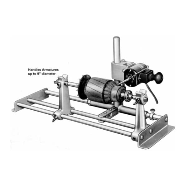 The Lathe-Type Undercutter can be quickly attached in place of the tool post on any lathe. It can be mounted directly on the cross slide, or on the slide carriage which is then mounted on the cross slide. Both horizontal and vertical commutators can be undercut. As undercutting is done from the side of the commutator the saw or inVin cutter is set level with the lathe centers. Undercutter is powered by a 1/3 h.p. motor and uses high-speed steel or tungsten-carbide saw or inVin cutters. A spring between hardened washers under the pulley allows the spindle to move infloatin up or down and follow an existing slot that is being re-cut. If a fixed spindle is desired, the spring can be removed and the pulley turned over. There are two versions of the Lathe-Type undercutter available, depending on the amount of clearance needed to clear larger diameter risers. NEEDS TO BE PAIRED WITH AN AIR FILTER LUBRICATOR