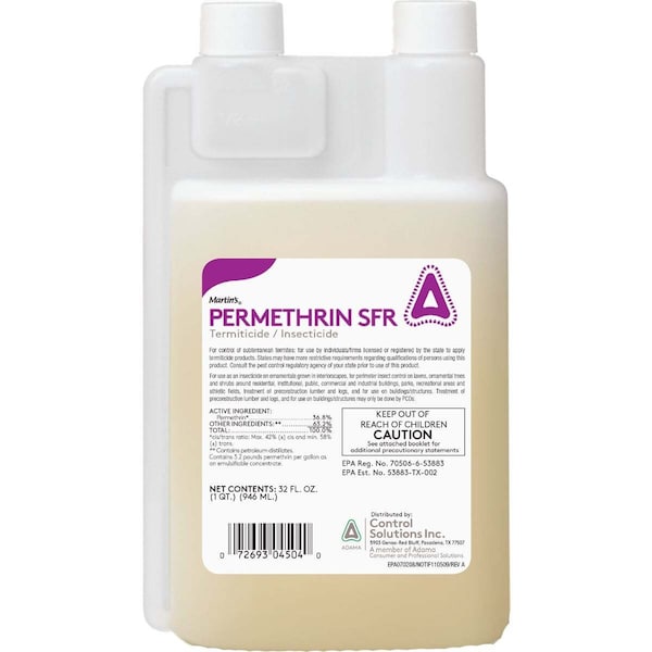 INSECT/TRMTS PERMETHRIN QT Specifications: Compositions: Permethrin Hydrocarbon Solvent A broad-use professional strength termiticide/insecticide. Labeled for both pre and post-construction termite applications. Can be used on lawns, around homes, landscapes ornamentals, sheds and barns on a variety of insects. Safe for use in and around animal housing, including poultry houses and on listed animals. Effective against ants, bees, beetles, boxelder bugs, cockroaches, crickets, earwigs, flies, millipedes, mole crickets, pill bugs, scorpions, silverfish, spiders, ticks, termites and wasps. Contains permethrin active ingredients.