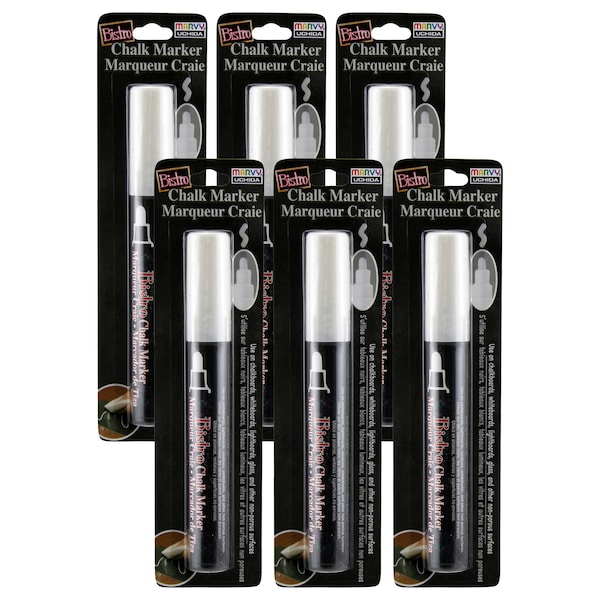 Bistro Chalk Markers are the perfect every day chalk marker. These chalk markers work on chalkboards, dry erase boards, light boards, windows, windshields, and other non-porous surfaces so you can write or create art virtually anywhere. Sold as a pack of 6 markers.