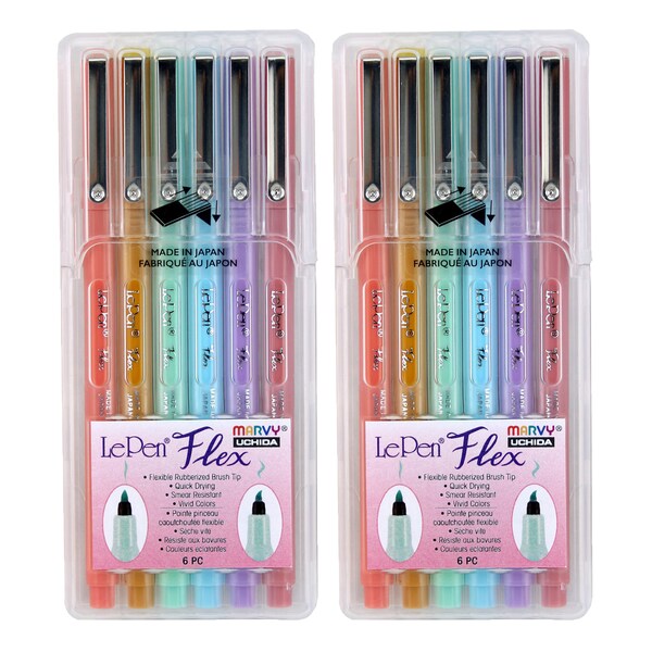 Our Brand New LePenĀ® Flex is here. The Le Pen Flex comes with a durable, flexible rubberized brush tip that is great for hand lettering, journals, planners and much more. Each set includes 6 pens: ochre, coral pink, pale blue, wisteria, dusty pink, and peppermint. Sold as 2 sets for a total of 12 pens.