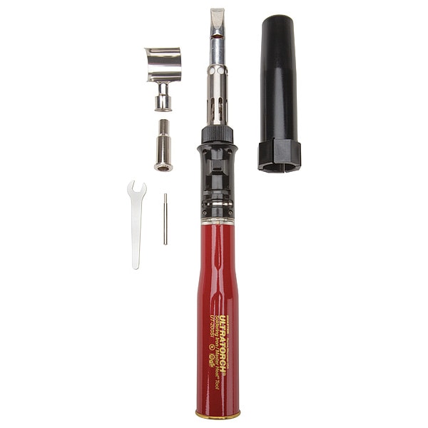 Heat Tool, Ignition Type Self-Igniting, Tool Functions Flameless Heat Tool, Soldering Iron, Electric Iron Power Equivalence (Maximum) 200 W, Series Ultratorch UT-200, Maximum Solder Tip Temperature 986 Degrees F, Tip Type Chisel, Heat Shrink, Hot Air, Tip Width 10 mm, Run Time 150 min, Maximum Torch Temperature 2,372 Degrees F, Maximum Hot Air Tip Temperature 1,004 Degrees F, Includes Protective Cap, Shrink Attachment, Tip Manufacturer Part Number 72-01-02, 72-01-52, 72-01-55