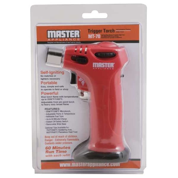 Triggertorch, Ignition Type Self-Igniting, Flame Adjustment Adjustable Temperature, Tool Functions Torch, Series Mini-Triggertorch MT-70, Tip Type Not Included, Run Time 60 min, Maximum Torch Temperature 2,500 Degrees F, Includes Built in Refillable Fuel Tank and Removable Base, Application Desoldering, Ignite Materials, Melt Plastic, Shrink Tubing, Soldering, Terminate Specialty Connectors, Heat Parts