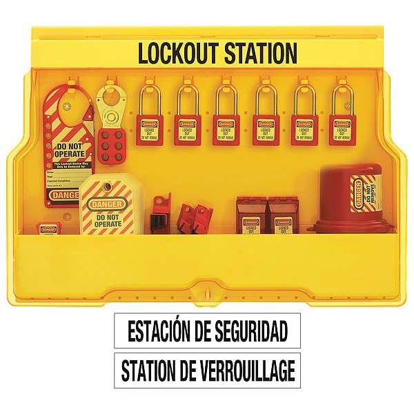 Lockout Station, Cable Lockouts Included 0, Cover Type Closed, Electrical Lockouts Included (2) Plug Lockout Devices, (2) Wall Switch Lockout Devices, (6) Circuit Breaker Lockout Devices, Filled Yes, Number of Hasps Included 2, Number of Lockouts Included 47, Number of Padlocks Included 6, Number of Tags Included 24, Visibility Inside Clear Door/Window, For Lockout Type Electrical, Language English, French, Spanish, Mount Type Fasteners, Background Color Yellow