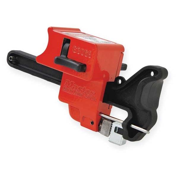 Ball Valve Lockout, Ball Valve Lockout Type Clamp On, For Handle Type Quarter Turn Handle, For Maximum Padlock Shackle Diameter 9/32 in, For Maximum Pipe Size 4 in, For Minimum Pipe Size 1/4 in, Maximum Number of Padlocks 1, Features Handle-On Ball Valve Lockout, Clamps tight on handle stop to prevent handle movement, Works on insulated pipes and in close quarters, Includes English Labels, French Labels, Spanish Labels, Language English, French, Spanish, Lockout Color Red