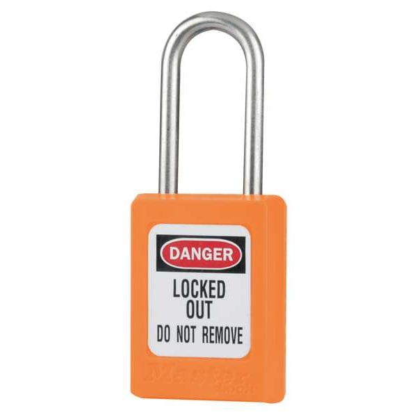 Lockout Padlock, Body Color Orange, Body Height 1 13/16 in, Body Material Thermoplastic, Body Thickness 11/16 in, Body Width 1 3/8 in, Header Danger, Horizontal Shackle Clearance 5/8 in, Key Style Standard, Key Type Keyed Alike, Non-Removable Key No, Resistance Properties Chemical Resistant, Shackle Diameter 3/16 in, Shackle Height 1 1/2 in, Shackle Material Stainless Steel, Shackle Type Open, Vertical Shackle Clearance 1 1/2 in, Width Across Shackle 5/8 in, Includes (2) Keys, Labels