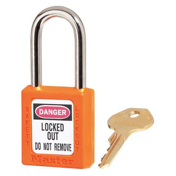 Lockout Padlock, Body Color Orange, Body Height 1 3/4 in, Body Material Thermoplastic, Body Thickness 3/4 in, Body Width 1 1/2 in, Header Danger, Horizontal Shackle Clearance 13/16 in, Key Style Standard, Key Type Keyed Different, Non-Removable Key Yes, Resistance Properties Chemical Resistant, Shackle Diameter 1/4 in, Shackle Height 1 1/2 in, Shackle Material Metal, Shackle Type Open, Vertical Shackle Clearance 1 1/2 in, Width Across Shackle 13/16 in, Features Non-Conductive