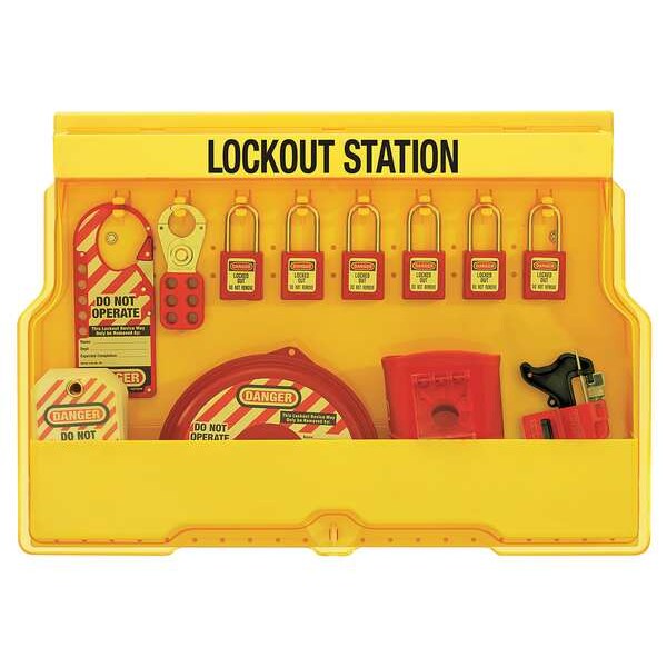 Lockout Station, Number of Padlocks Included 6, Language English, Includes (6) Red Thermoplastic Padlocks, (8) Key Hooks, (1) 1 in Steel Jaw dia Hasp, (1) Red Labeled Snap-On Hasp, (3) Gate Valve Lockouts (1 in to 6 1/2 in Valves), (2) Ball Valve Lockouts, (5) Moveable Dividers, (24) Tags, (24) Ties, Legend Lockout Station, Material Polycarbonate, Number of Hooks 8