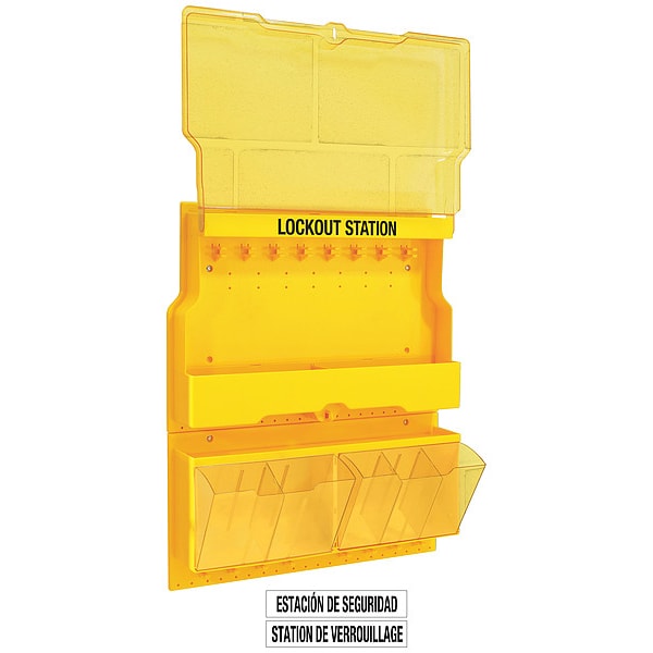 Lockout Station, Cable Lockouts Included 0, Cover Type Closed, Filled No, Number of Hasps Included 0, Number of Lockouts Included 0, Number of Padlocks Included 0, Number of Tags Included 0, Visibility Inside Clear Door/Window, Language English, Mount Type Fasteners, Background Color Yellow, Includes (5) Moveable Dividers, Cover, Legend Lockout Station, Legend Type Text, Material Polycarbonate, Mounting Location Wall, Number of Compartments 6, Number of Hooks 16, Number of Padlocks Held 32