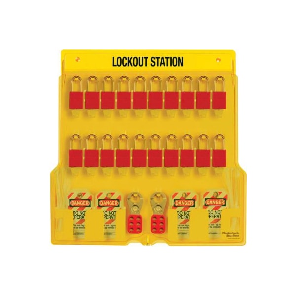 Master lock 20 padlock station with cover, 1484bp1106 the master lock no. 1484bp1106 safety lockout covered padlock station includes 20 american lock no. A1106red anodized aluminum keyed different padlocks. Padlock station features integrated, one-piece molded construction to eliminate loose parts and resilient polycarbonate material to provide twice the heat resistance and quadruple the impact strength of typical stations. The exclusive translucent cover protects contents and is lockable to prevent loss of valuable products. Safety hasps and tags included. features: safety lockout covered padlock station with 20 of the a1106red aluminum padlocks, keyed different also contains 4 - 420 hasps and 4 bags 12/bag of the 497a tags exclusive lockable translucent cover protects contents from dust and grime and ensures the lockout padlocks are there when you need them resilient polycarbonate material provides twice the heat resistance and quadruple the impact strength of typical stations one piece molded construction means no glued hanger clips or tag pockets to ever come loose reinforced snap-on clips provide easy padlock and hasp storage and removal station measures 22 high x 22 wide x 1-3/4 deep 55.8cm x 55.8cm x 4.4cm