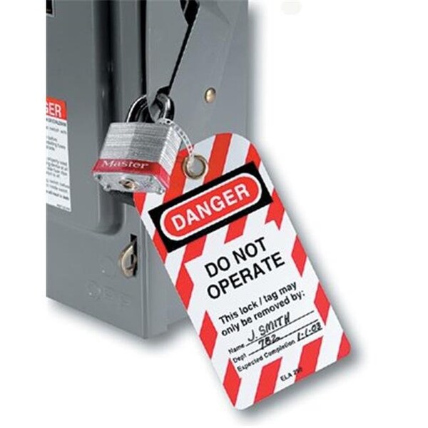 Durable polyester laminate resists water, grease and extreme temperaturesHeavy-Duty construction withstands up to 80 lbs. of pullout force (Meets OSHA Requirements); Prevents accidental removal . Customize with name, department, expected completion . 7/16" Diameter brass grommet accepts all safety padlocks