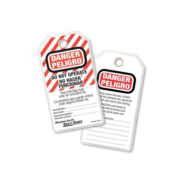 Master lock safety danger - do not operate lockout tags , spanish/english pkg qty 12, 497ax the master lock no. 497a heavy duty english/spanish safety tags feature durable polyester laminate to resist water, grease and extreme temperatures. The heavy duty construction withstands over 50 lbs. 23kg of pull force to meet and comply with the osha lockout/tagout standard. The 7/16in 11mm diameter brass grommet accepts all safety padlocks. Tags are customizable with name, department and expected completion date. features: heavy duty spanish/english tags 5-3/4in 146mm high x 3-1/8in 79mm wide heavy duty spanish/english safety tags 7/16in 11mm diameter brass grommet accepts all safety padlocks complies with osha lockout tagout standard durable polyester laminate resists water, grease and extreme temperatures heavy duty construction withstands over 50 lbs. 23kg of pullout force meets osha requirement customize with name, department, expected completion one item consists of 1 bag with 12 tags and 12 ties