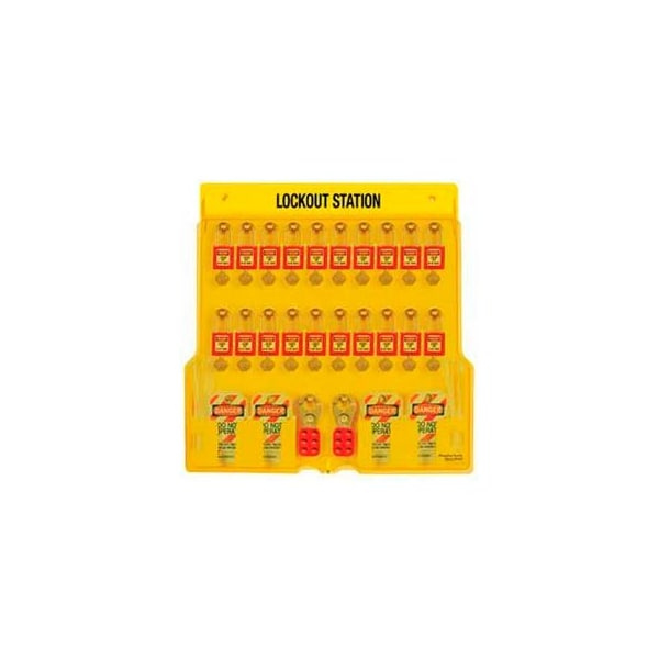features safety lockout covered padlock station with 20 of the 410red zenex padlocks, keyed different also contains 4 - 420 hasps and 4 bags 12/bag of the 497a tags exclusive lockable translucent cover protects contents from dust and grime and ensures the lockout padlocks are there when you need them resilient polycarbonate material provides twice the heat resistance and quadruple the impact strength of typical stations one piece molded construction means no glued hanger clips or tag pockets to ever come loose reinforced snap-on clips provide easy padlock and hasp storage and removal zenex padlock includes front and rear labels in english, spanish and french station measures 22 high x 22 wide x 1-3/4 deep 55.8cm x 55.8cm x 4.4cm includes a no-charge safety lockout padlock key charting system - simply return the enclosed mail-in card after your purchase. Master lock will supply a registered system number, maintain a record of the padlock key cuts provided with your station and ensure that there is no duplication on your future orders of safety padlocks. preventing key duplications in your lockout programs is critical