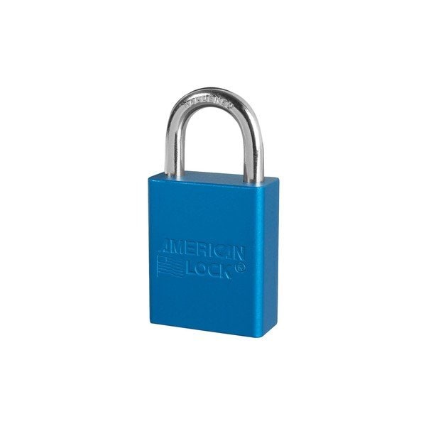 Padlock, Style: 5 pin cylinder, Size: 1-1/2, Material: Aluminum, Color: Blue, Keyed: Keyed Differently, Shackle Diameter: 1/4, Shackle Clearance: 1, Packaging Qty: 24 per case