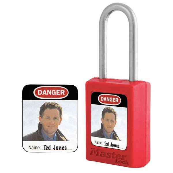 Photo ID Label, Front Side Legend Name:___, Header Danger, Language English, Legend Type Text, Mount Type Adhesive, Number of Printed Sides 1, Overall Height 1 1/4 in, Overall Width 1 in, Reverse Side Legend Danger, Name, Sign Background Color White, Sign Material Paper, Sign Out Sections Name, Signage Type Label, Write-On Surface Yes, Header Background Color Black, Red, White, Header Text Color White, Legend Color White, Maximum Temperature 200 Degrees F, Metal Detectable No
