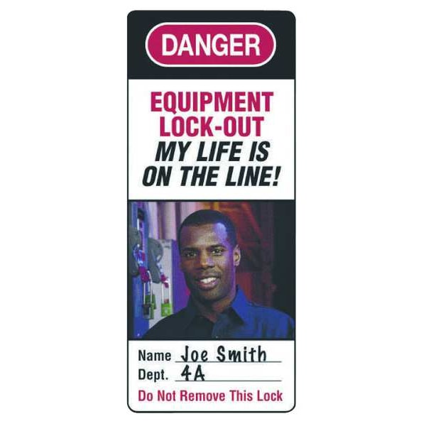 Photo Identification Label, Front Side Legend Equipment Lock Out My Life is On The Line Name: Dept: Do Not Remove This Lock, Header Danger, Language English, Mount Type Adhesive, Number of Printed Sides 1, Overall Height 2 3/8 in, Overall Width 1 in, Sign Material Vinyl, Write-On Surface Yes, Header Background Color Black, Red, White, Header Text Color White, Legend Color White, Maximum Temperature 200 Degrees F, Metal Detectable No, Minimum Temperature -40 Degrees F, Package Quantity 6