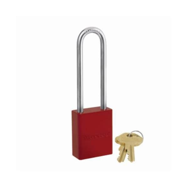 Master Lock safety padlock rekeyable, series: Proseries, keyed different key, powder coated aluminum body, 1/4 in shackle dia, 3 in shackle height, 25/32 in shackle width, boron shackle, 1-1/2 in body width, 1-15/16 in body height, 5-Pin tumbler cylindrical locking mechanism, red.