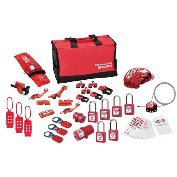 Group Safety Lockout Kit, Valve/Electrical, Filled Yes, For Maximum Hand Wheel Diameter 6 1/2 in, Number of Lockouts Included 22, Number of Tags Included 12, Carrying Case Type Bag, For Valve Handle Type Hand Wheel, Lever Handle, Included Lockout Types Ball Valve, Cable Lockout, Circuit Breaker, Hasp, Plug, Valve Lockout, Language English, French, Spanish, Carrying Case Dimensions 9.5 in D x 6.75 in W x 15 in H, Carrying Case Material Cloth