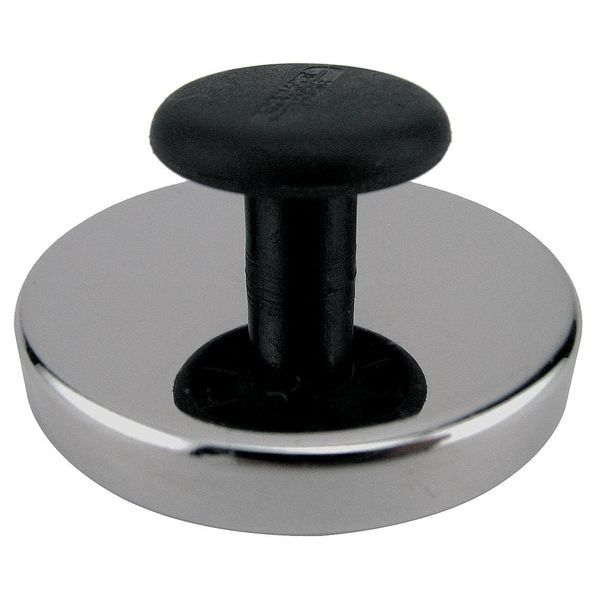 Holding Magnet, Type Round BaseHeight (In.) 1 Dia. (In.) 2 Max. Pull (Lb.) 20, Magnetic Strength 20 lb., Stability Temp. (Deg. F) 400, Steel Cup, Ceramic Ring Magnet, Hard Plastic Knob, Vinyl Liner, Black, Nickel Plated, Includes Non-Scratch Liner