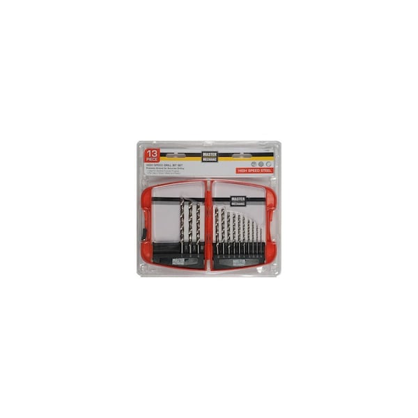 Master Mechanic, 13 Piece, High Speed Steel, Drill Bit Set, Contains 1/16in, 5/64in, 3/32in, 7/64in, 1/8in, 9/64in, 5/32in, 11/64in, 3/16in, 13/64in, 7/32in, 15/64in, 1/4in, 118 Point, Bright Silver Finish, Steel Shank, Jobber Length, Features 2 Cutting Edges & Polished Flutes, Recommended For Drilling Wood, Plastic, Wallboard & Plywood, For Moderate Use In Soft Metal, Brass, Bronze, Sheet Metal & Aluminum, Plastic Storage Case With Hang Tab.