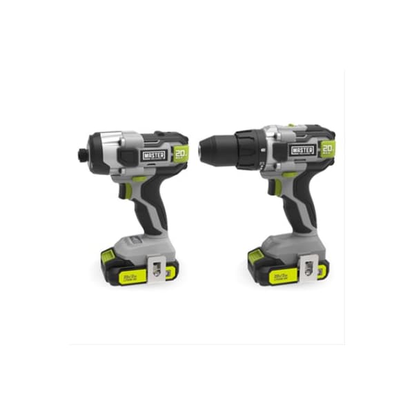 Master Mechanic, 20V, lithiumIon drill impact combo kit, compact, 12 cordless lithiumion drill Features 2 speed, variable speed trigger switch with brake, steel chuck with spindle lock, ergonomic design, 231 torque settings, 0450, 01800 RPM, powerful 442 INLB torque, on board trigger activated LED work light, over molded soft grip handle, 20V, LithiumIon, Compact Cordless Impact Driver features 01300, 02000, 02900 RPM, 04060 BPM, 1500 INLB Of Torque, integrated 3 LED work lights, forwardreverse switch, rubber over mold, Includes 2 20Ah lithiumion batteries, 1 hour quick charger, nylon tote Compatible TV 103728 MM 20V battery 15A, TV 103729 MM 20V battery 3A sold separately