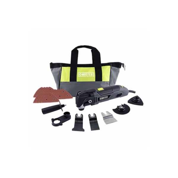 Master Mechanic oscillating tool kit, 25A, 1100022000 no load speed, tool free blade change, 3,degree oscillating angle LED lgiht, Includes 1 318 sanding pad, 12 sand paper sheets, 1 rigid scraper blade, 1 114 bimetal flush cut blade, 1 high speed steel segmented saw blade, 1 134 coarse tooth blade, 1 side handle, 1 dust adaptor, compatible with Dremel, nylon tote