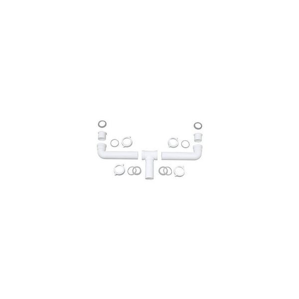 Master Plumber, White, Plastic, 2 Bowl Center Outlet Drain, For Kitchen Sink, 1-1/2" O.D. Tube Slip Joint to Tailpiece Or Direct Connect To Strainer, Baffled Tee, Includes Hi Line Adaptors, Nuts & Washers, Carded.