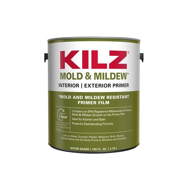 Kilz Mold & Mildew Gallon Interior/Exterior Water Based Primer Sealer & Stain Blocker Specially Designed For Residential Surfaces In High Humidity Moisture & Temperature Environments Like Kitchens & Bathrooms Excellent Adhesion EPA Registered Active Ingredient Creates Mold & Mildew-Resistant Film Fast Drying Low Odor Low VOC Formula Easy To Clean With Soap & Water.