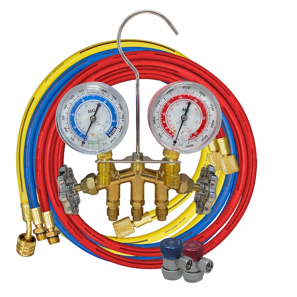 Manifold, 2-1/2 Inch Gauge, (3) 72 Inch Hose (Blue and Red Hose 14 Millimeter Male Connection), Yellow Hose (1/2 Inch Acme Fale with Auto-Shut-Off Valve), Manual Coupler