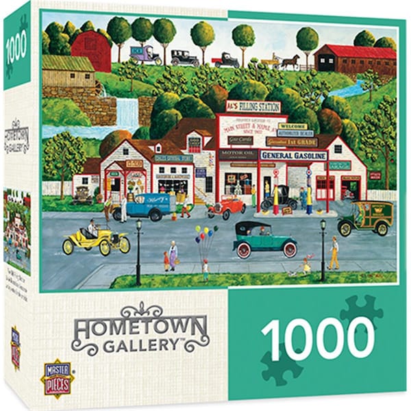 Hometown Gallery Puzzle was painted by the talented folk artist, Art Poulin, and features an old-timey gas station, with a road full of classic cars, waiting in line for the gas attendant.