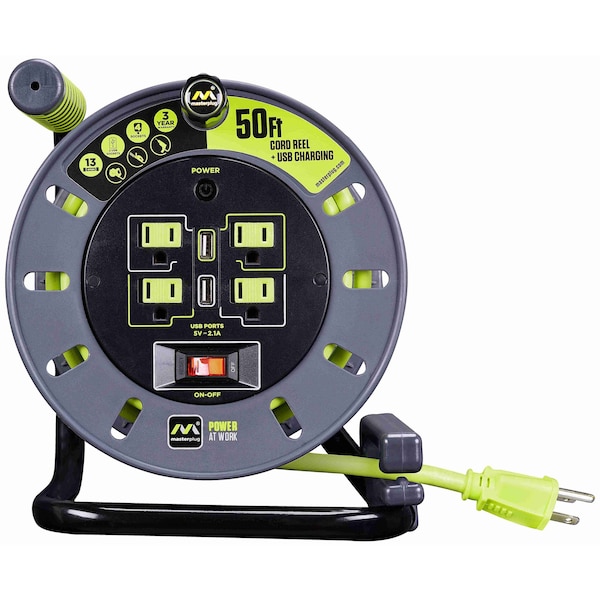 - •4 outlet cord reel with high visibility 14AWG cord, easy winding handle and 2 integrated USB charging ports