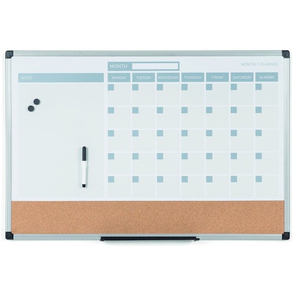 Three-in-one monthly planner provides functionality times three for efficient planning and organization. Dry-erase calendar planner provides space for lists and a bulletin surface for your important cards and notes. Compact size fits conveniently in smaller spaces for use in any working context. Magnetic Gold Ultra surface resists staining and is suitable for frequent use. Included mounting hardware works with the four-corner system to mount the board either vertically or horizontally for optimal placement. Monthly planner is perfect for cubicles, personal work spaces and more.
