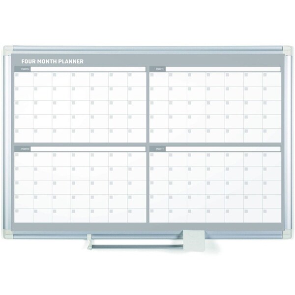 Four-month planner offers the perfect planning and presentation solution, suiting all office needs. Magnetic Gold Ultra dry-erase surface is scratch-resistant and ghost-resistant. Calendar is ideal for managing teams and schedules with four months on one board. Modern, sturdy aluminum frame allows the board to fit any environment, and a sliding pen tray keeps all accessories close at hand. Dry-erase planner includes a wall-fastening kit.