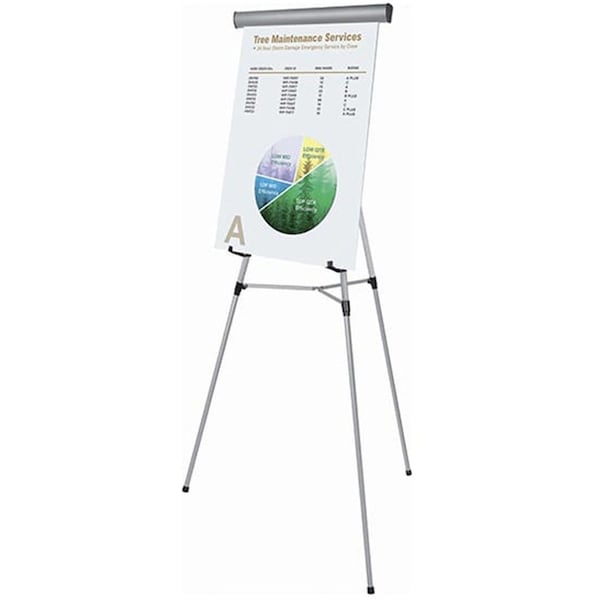 Lightweight display easel can hold any size easel pad with its full-width, no-pinch pad retainer that easily snaps off and on. Metal easel also adjusts in height from 34" to 63" for tabletop or floor display. Sturdy telescoping legs feature a heavyweight locking center brace for stability and supports weight up to 25 lb. Adjustable sign holders lock into place. Three-leg display easel also folds easily for storage or transport and features rubber nonskid feet. Legs are made of aluminum. Support arms are made of plastic.