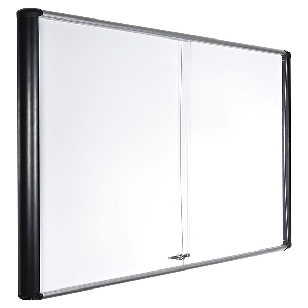 Enclosed Dry Erase Board, Dry Erase, Magnetic Letter, Board Material Porcelain, Width 72 in, Height 48 in, Board Frame Material Aluminum, Frame Color Black, Board Color White, Number of Doors 2, Door Type Sliding, Includes (2) Keys, Mounting/Mobility Type Wall Mounted, Door Material Glass, Indoor Enclosed Bulletin Board