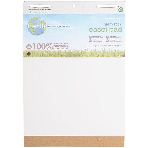 Self-stick easel pad is made with a high percentage of recycled material and is 100 percent recyclable. Bright white sheets are easy to turn. Easel pad features a foldout tray to store markers (sold separately). Carry easily with built-in handle.