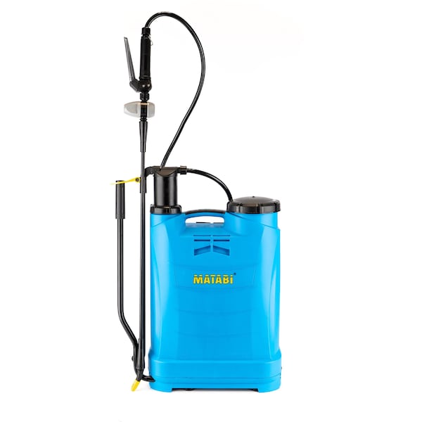 Versatile manual backpack sprayer with 16 litre capacity (4-Gallon). Its stainless steel handle is a reliable and long-lasting operation. It includes a selection of nozzles that allows different types of application. Sprayer suitable for use in large gardens.Matabi 4-gallon manual pump-up backpack sprayer.