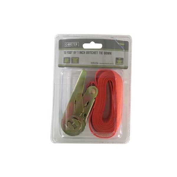 Master Mechanic, 1 x 13', Loop Ratchet Tie Down, Space Saver, 900 LB Rated Capacity, 300 LB Working Load Limit, Ratchet Provides Maximum Tensioning With Minimum Force, HiTest, Abrasion Resistant Webbing, Ideal For Auto SUV Roof Racks