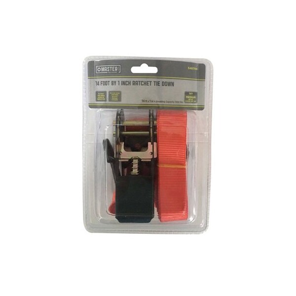 Master Mechanic, 1 x 14', Red, Ratchet Tie Down, 400 LB Working Load Limit, 1,200 LB Rated Capacity, Polyester Webbing With Vinyl Coated S Hooks