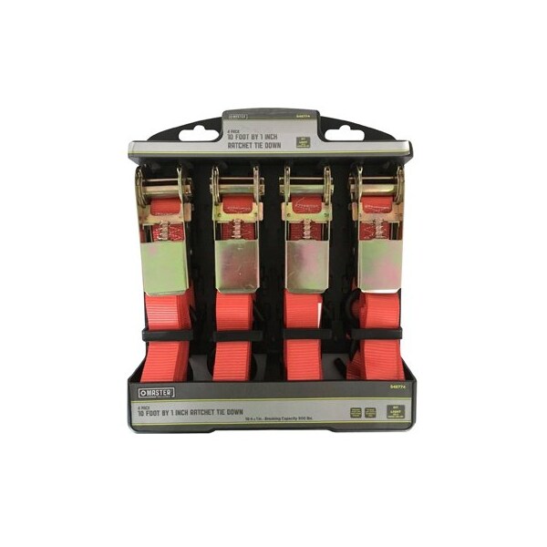 Master Mechanic, 4 Pack, 1 x 10' , Ratchet Tie Down, 900 LB Rated Capacity, 300 LB Working Load Limit, Hi Test, Abrasion Resistant, Long Last Webbing, Compact, NonMarring Vinyl Coated SHooks