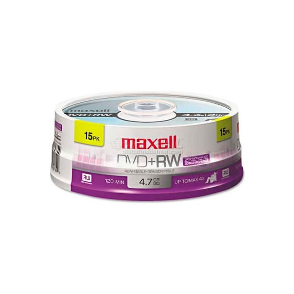Maxell 634046 dvd+rw discs, 4.7gb, 4x, spindle, silver, 15/pack rewritable disc offers convenience and quality. Great choice for cost-effective data management; use for routine backups, authoring/editing multimedia projects, large file storage, and more. Share large files easily with associates, friends, and family. Superior archival life ensures performance for years to come. Rewritable up to 1,000 times for long-term use. Read compatible with dvd playback devices for hassle-free sharing. Disk type: dvd+rw; capacity (video): 120 min. note: the capability to write standard cd/dvd formats is drive dependent. Recorders, players and drives will play standard cd/dvd disc.. packaging details: jewel case packaging includes jewel case and insert. Spindle product is packaged in a plastic container and does not include jewel cases or inserts.. larger quantity quotes available. Please call 1-888-978-7759. this product arrives to most customers in 2-3 business days.