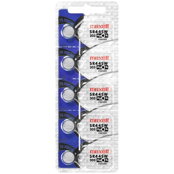 5PK Maxell Silver Oxide SR44SW Low Drain Watch Battery Replaces 303, 303/357, 357, 541, 76A, 76PX, 76S, A76, AG13 The 303, or SR44SW, is a rare Silver-Oxide cell normally used in watches, with a shelf life of 5+ years. 5PK Maxell Silver Oxide SR44SW Low Drain Watch Battery Also Known As: 1107SO, 1131SOP, 13GA, 157, 303, 303/357, 357, 541, 76A, 76PX, 76S, A76, AG13, AWI A01, AWI M02, AWI S05, Citizen 280-08, Citizen 280-62, D303/357, D357, EPX76, KS35, KS76, LR44, PX76, S76, SG13, SP357, SR1154, SR1154SW, SR44, SR44W, Seiko SB-A9, Seiko SB-B9, Timex A, Timex J, V357 5PK Maxell Silver Oxide SR44SW Low Drain Watch Battery Compatibility ENERGIZER: 303 DURACELL: D303 RAYOVAC: 303 VARTA: V303 RENATA: 303 CITIZEN: 280-08