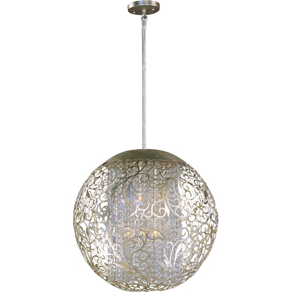 The Arabesque collection's intricate patterns are formed in metal and finished in Golden Silver. Strands of crystal beads add sparkle as they shimmer through the Xenon lamps. Unique oval-shaped pendants add a touch of class to any room.