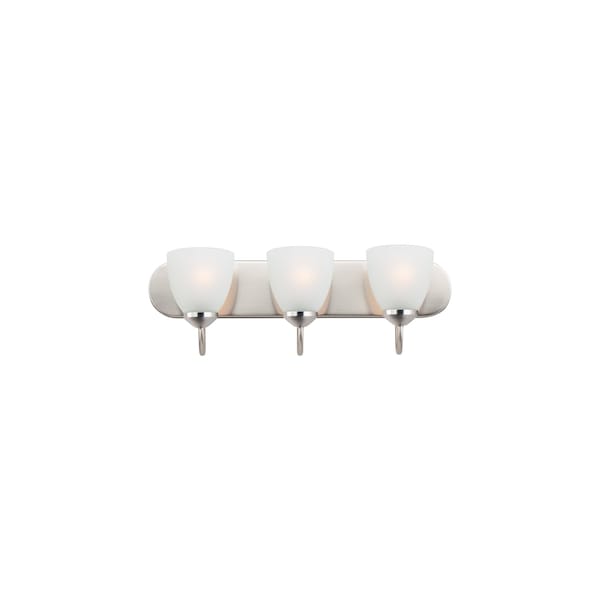This transitional design works in any style home. Full length oval backplates support simple bell-shaped, Frosted glass shades. Available in Satin Nickel, Matte Black, and Polished Chrome.