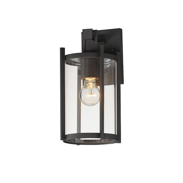Squared columns in Matte Black finish tower above the cylindrical glass shade rated for outdoor applications. A rectangular hook detail carries the square form through to the backplate. A modern interpretation of a bell tower, these outdoor pendants and sconces are a cleaned up, transitional look for exteriors.