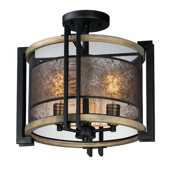 Frames of wood finished in Barn Wood and cradled by Black metal brackets were used to create this beautiful rustic design. The Black mesh screen is accented with a band of mica and Antique Brass sockets to deliver rustic charm with all the right fixings.