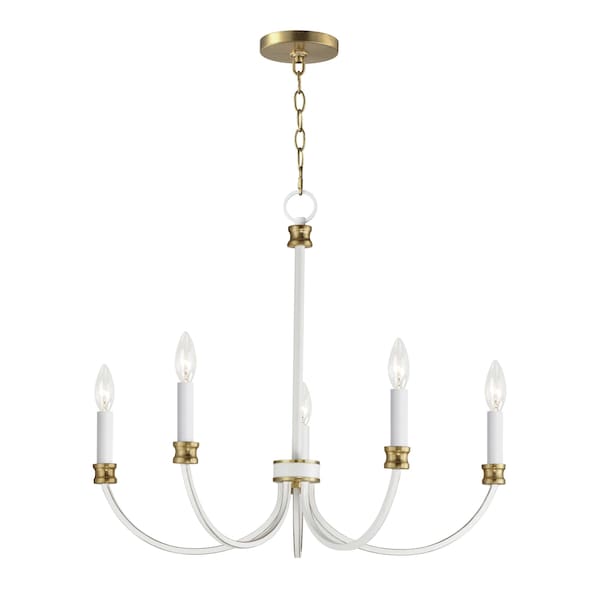 A lovely candelabra style collection with rich accents. This seemingly simple chandelier highlights classically curving accents in a stately combination of Black with Antique Brass accents or chic Weathered White with Gold Leaf accents. Taking a streamlined approach to the archetypal chandelier form, this series updates uses squared tubing to subtly modernize an approachable design with exposed candelabra lighting.