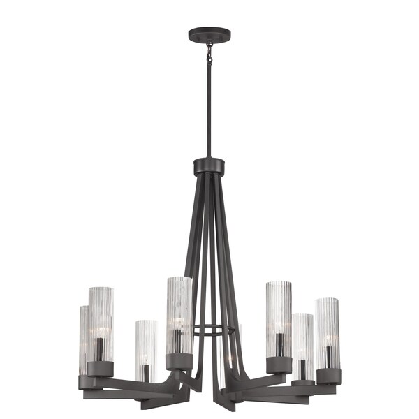 Evocative of the past and modernized for today, the Delos collection features ironwork finished in a textured Anthracite that support hefty glass columns. The glass shades are elongated to accentuate the verticality of the chandelier and the fluted glass shades diffuse the light in an interesting and subtly romantic way, giving the appearance of candlelight.